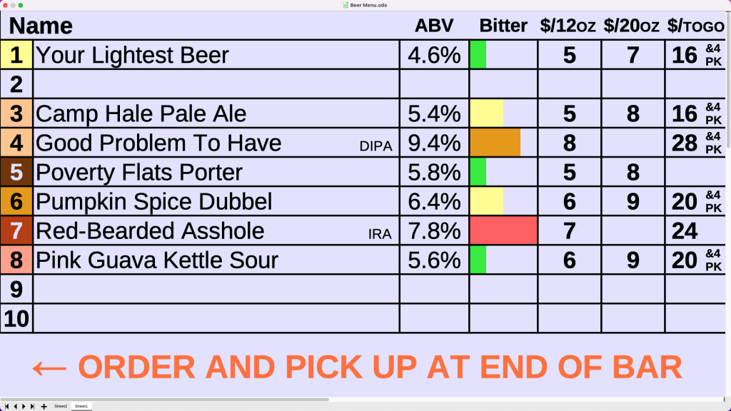 NOT ON TAPAnthony works at the old Dollar Bar, saving his pennies for Two Mile. Brewmaster Sean left a note on door, saying we’re out of Porter for a while. But if that’s what you have in mind, if dark beer’s what you’re all about, if that’s what you’d like then try… our milk stout. |